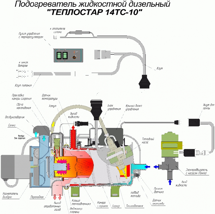 Жидкостный предпусковой подогреватель Теплостар 14ТС-10 (дизель, 24В) - предназначенный для прогрева дизельных двигателей с объемом более 4 литров. 14ТС-10 обладает максимальной производительностью. Отопительная мощность составляет 12 кВт.
